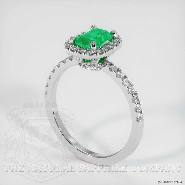 The ring features a beautiful, transparent 0.74 carat emerald cut shape green emerald with the dimensions of 6.82 x 4.63 x 3.39 mm and a step cut. It has a clarity grade of slightly included (evaluated at eye level), light color saturation, and an excellent polish. The origin of this emerald is Zambia.