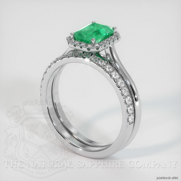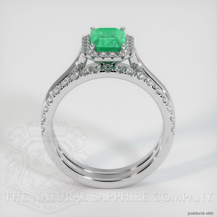 The ring features a beautiful, transparent 0.82 carat emerald cut shape green emerald with the dimensions of 7.17 x 5.21 x 3.09 mm and a emerald cut. It has a clarity grade of very slightly included (evaluated at eye level), medium color saturation, and an excellent polish. The origin of this emerald is Zambia.