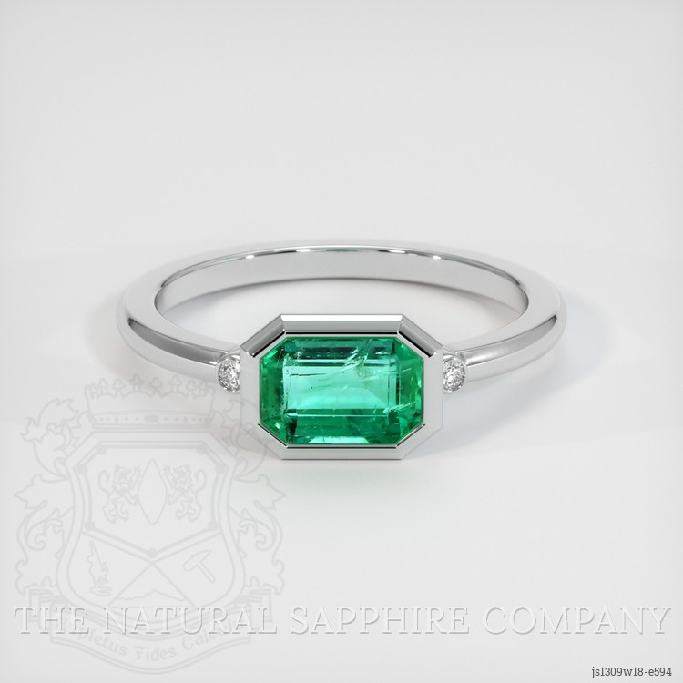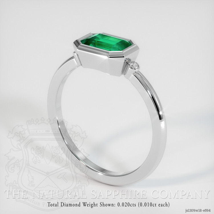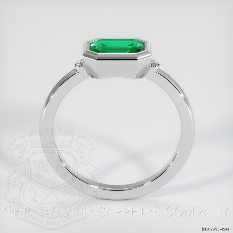 The ring features a beautiful, transparent 0.88 carat emerald cut shape green emerald with the dimensions of 7.19 x 5.05 x 3.33 mm and a emerald cut. It has a clarity grade of slightly included (evaluated at eye level), medium color saturation, and an excellent polish. The origin of this emerald is Zambia.