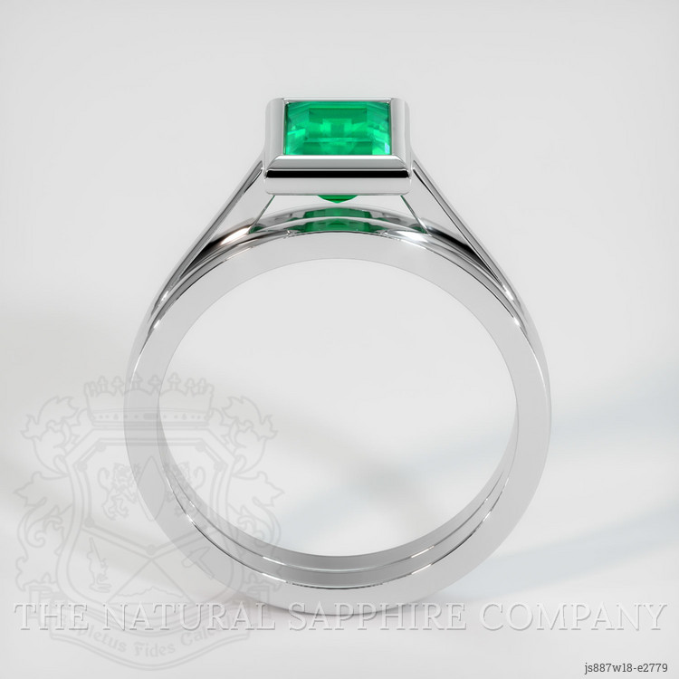 The ring features a beautiful, transparent 0.93 carat emerald cut shape green emerald with the dimensions of 6.69 x 4.85 x 3.78 mm and a step cut. It has a clarity grade of slightly included (evaluated at eye level), intense color saturation, and an excellent polish. The origin of this emerald is Colombia.