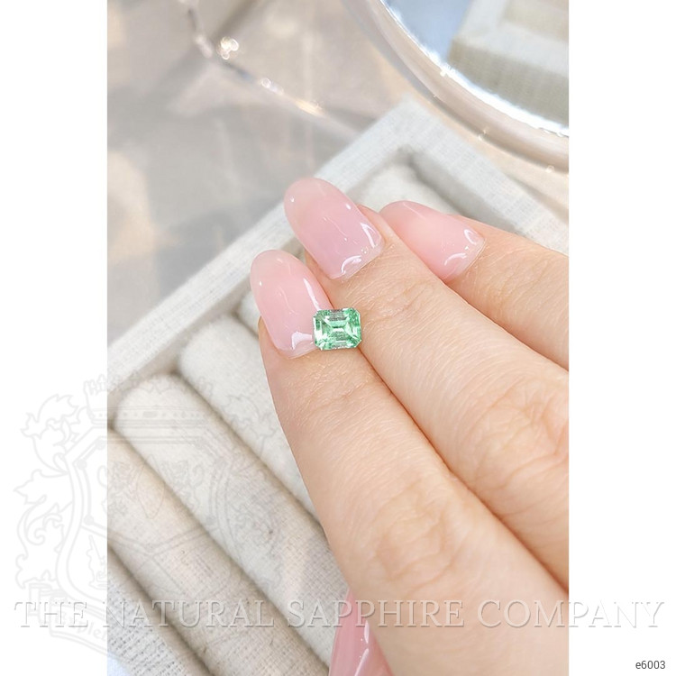 Crafted with an exquisite sense of elegance and sophistication, this ring from The Natural Emerald Company presents a unique opportunity to own a truly rare piece of jewelry. At its heart lies a transparent 0.93-carat emerald, originating from the distant and captivating landscapes of Russia. Its emerald shape and cut accentuate the stone's natural beauty, measuring 6.06 x 5.09 x 4.44 mm in dimensions. Designed with slightly included clarity, this gem presents an enchanting play of light, glimmering with a subtle, light color saturation. An excellent polish completes its mesmerizing allure, reflecting grandeur from every angle.
