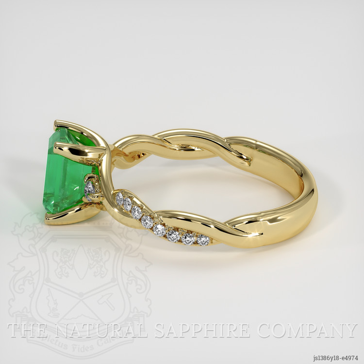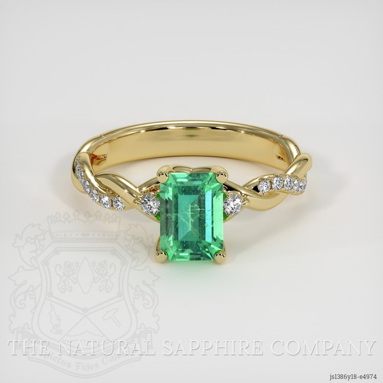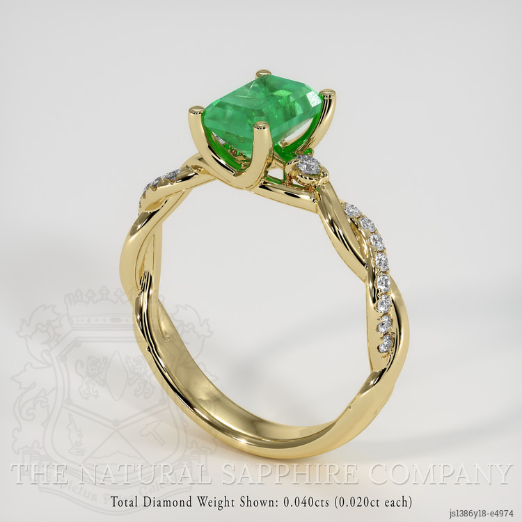 Completing the ring's magnificent composition are graceful accents of white round shaped natural diamonds. With a weight of approximately 0.04 carats, these accents possess a remarkable clarity grade of VS1, VS2, and a pristine color grade of F. Additional diamonds weigh approximately 0.09 carats, radiantly showcasing a VS clarity and a F/G color grade, enhancing the vibrant life of the central emerald. These diamonds, with their exceptional cut and polish, frame the emerald beautifully, set entirely in luxurious 18K yellow gold. The warm glow of yellow gold and the striking brilliance of the diamonds create a blend of classic sophistication and modern elegance, a signature hallmark of our renowned craftsmanship.