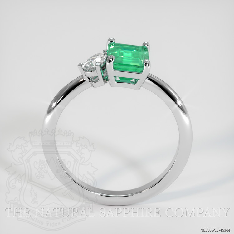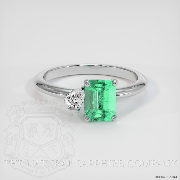 Complementing the emerald are white pear-shaped natural diamonds, weighing approximately 0.15 carats each. With a clarity grade of VS1 to VS2 and a color grade of E, these diamonds contribute a striking contrast to the lush green of the central gem. The pear-shaped diamonds enhance the overall aesthetic, framing the emerald with symmetry and elegance. The choice of an 18K white gold setting further amplifies the sophistication of this ring. The white gold exudes a contemporary elegance, presenting a lustrous finish that beautifully complements the vibrant green and scintillating diamonds.