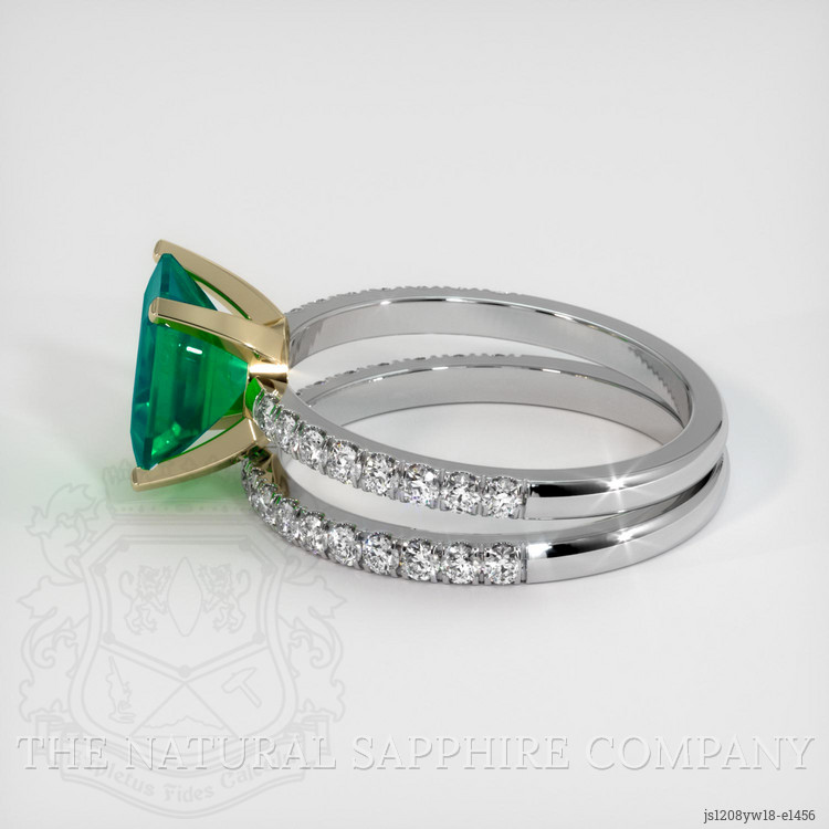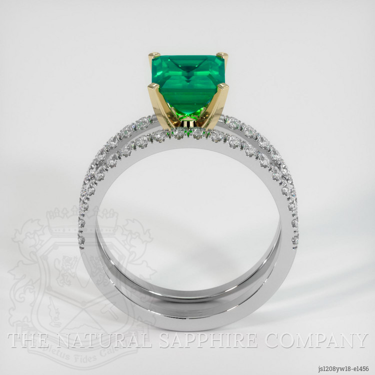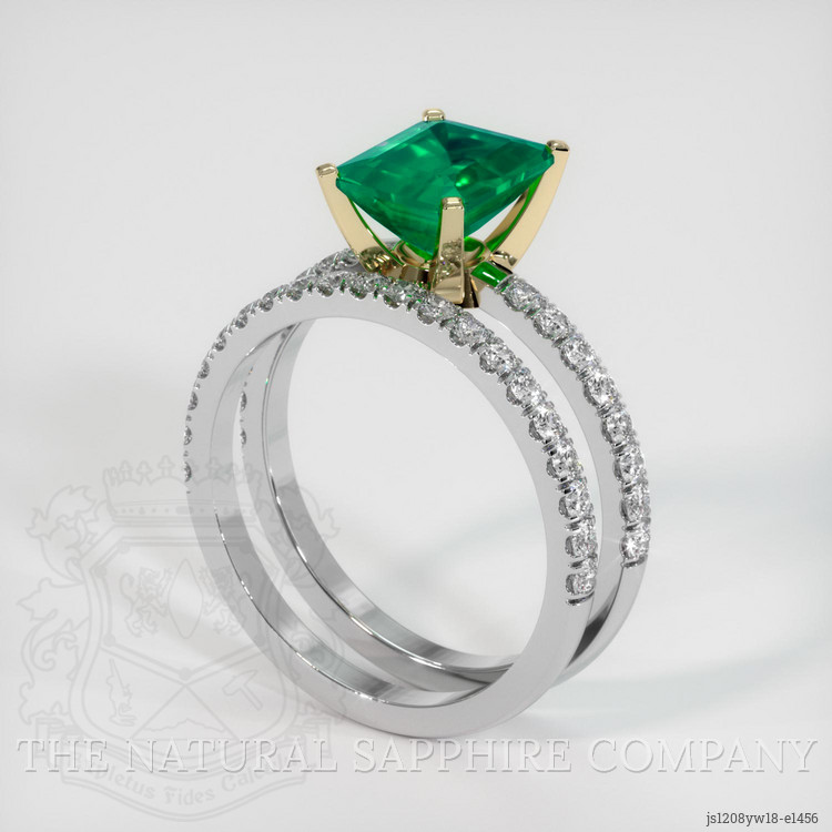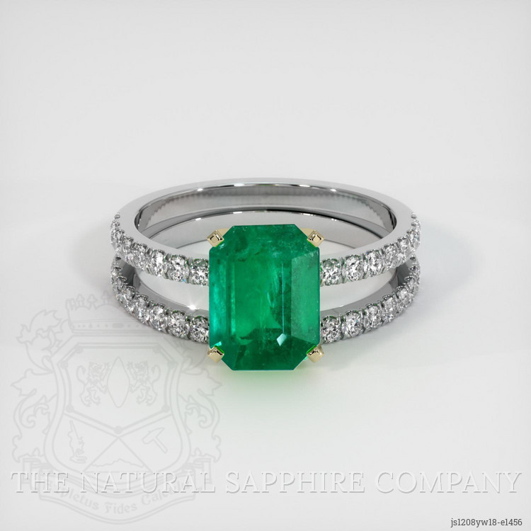 The ring features a beautiful, transparent 1.18 carat emerald cut shape green emerald with the dimensions of 7.86 x 6.10 x 4.03 mm and a emerald cut. It has a clarity grade of slightly included (evaluated at eye level), intense color saturation, and an excellent polish. The origin of this emerald is Zambia.
