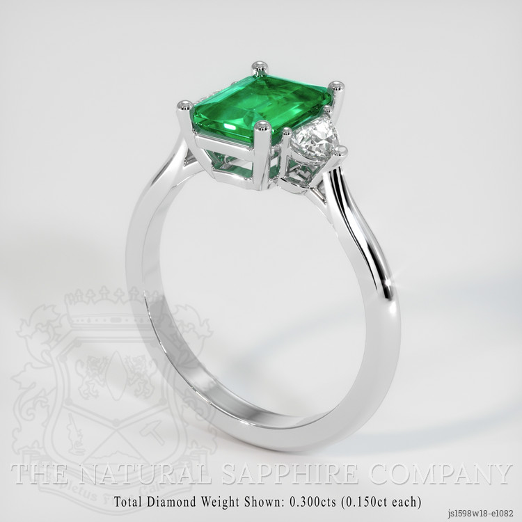 The ring features a beautiful, transparent 1.25 carat emerald cut shape green emerald with the dimensions of 8.18 x 6.06 x 3.51 mm and a emerald cut. It has a clarity grade of slightly included (evaluated at eye level), medium color saturation, and an excellent polish. The origin of this emerald is Zambia.