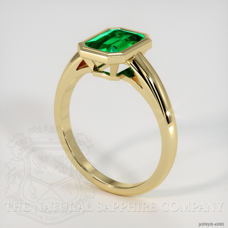 The story of this emerald doesn't end with the gem itself but continues with the setting that houses it. The ring is designed to highlight the gemstone's exceptional qualities, crafted entirely in 18K yellow gold. The warm hues of the gold setting contrast beautifully with the vibrant green of the emerald, creating an eye-catching display. The simplicity and elegance of the gold band are designed to not overshadow but enhance the color and clarity of the emerald.
