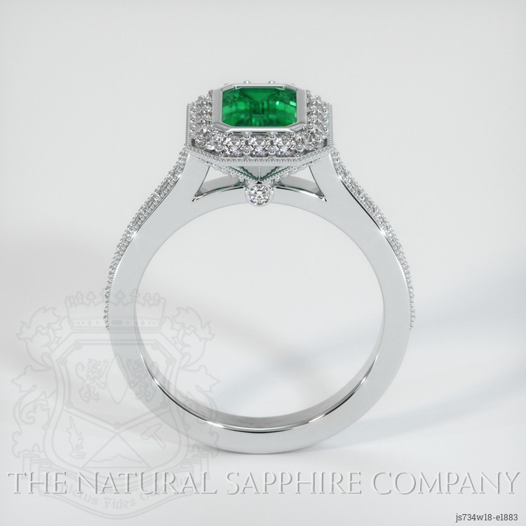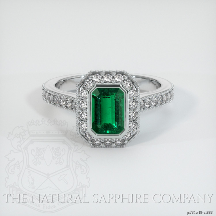 The ring features a beautiful, transparent 1.33 carat emerald cut shape green emerald with the dimensions of 7.88 x 5.71 x 3.90 mm and a emerald cut. It has a clarity grade of very slightly included (evaluated at eye level), vivid color saturation, and an excellent polish. The origin of this emerald is Zambia.