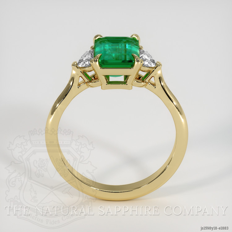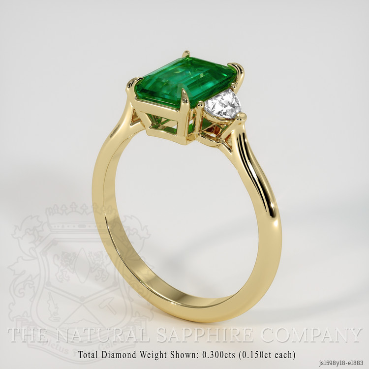 The effortless harmony of this elegant ring is further highlighted by two impeccably cut white half-moon diamonds, together weighing approximately 0.30 carats. With a clarity grade that stands at VS1 and VS2, and a color grade of G, these brilliant companions flank the central emerald like celestial guardians, offering their own ethereal glow. Set against the opulent, warm embrace of 18K yellow gold, each element of this masterpiece unites in a seamless tribute to love, whose value is not merely in the weight of the stones but in the depth of the emotions they symbolize. From every angle, it commands attention, whispers of a love story too profound for words, one that borrows the language of gemstones to express its quiet majesty.
