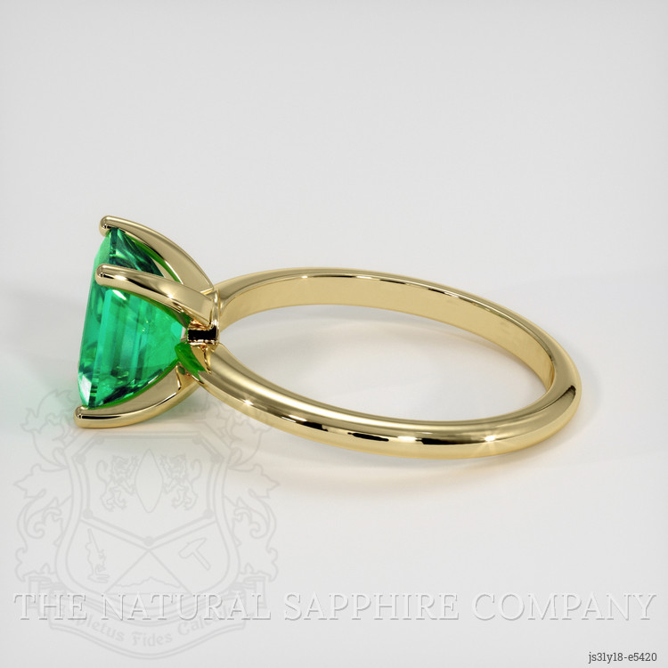 Setting the stage for this extraordinary gem is a sumptuous 18K yellow gold band. This choice of metal not only enhances the vibrant green of the emerald but also exudes warmth and richness, reinforcing the stone's inherent glamour. The gold band, with its silky, smooth texture, elegantly wraps around your finger, offering both luxury and comfort in perfect measure. The seamless integration of gold and gemstone accentuates the stunning centerpiece, thus ensuring that the emerald sings its own song of opulence.