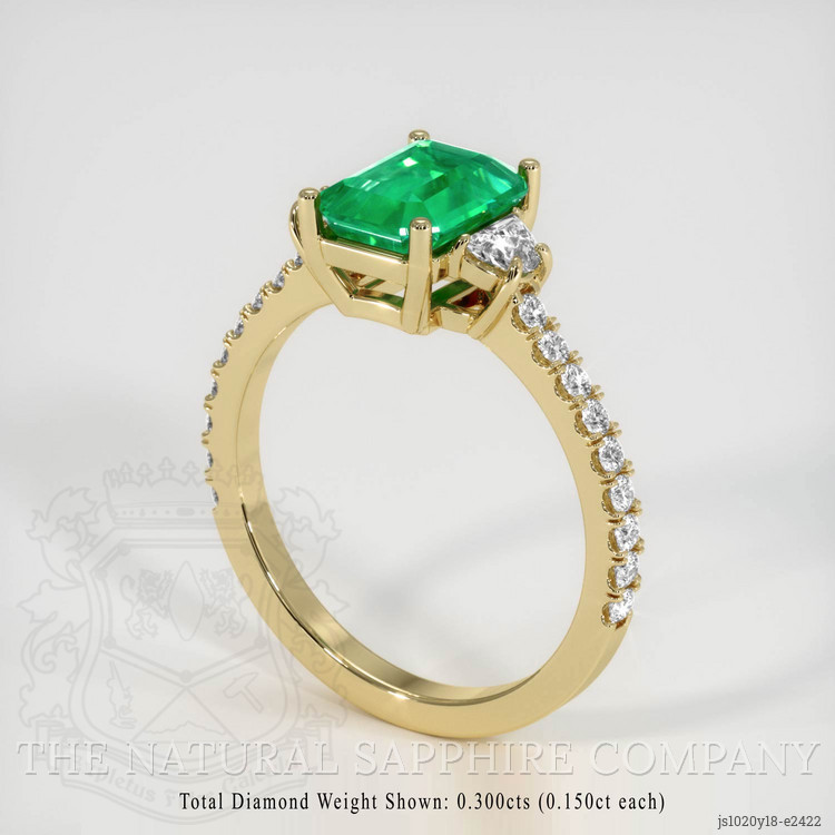 The ring features a beautiful, transparent 1.35 carat emerald cut shape green emerald with the dimensions of 7.95 x 6.04 x 3.79 mm and a step cut. It has a clarity grade of slightly included (evaluated at eye level), medium color saturation, and an excellent polish. The origin of this emerald is Zambia.