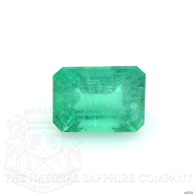 The ring features a beautiful, transparent 1.39 carat emerald cut shape green emerald with the dimensions of 7.83 x 5.56 x 4.46 mm and a emerald cut. It has a clarity grade of very slightly included (evaluated at eye level), light color saturation, and an excellent polish. The origin of this emerald is Zambia.