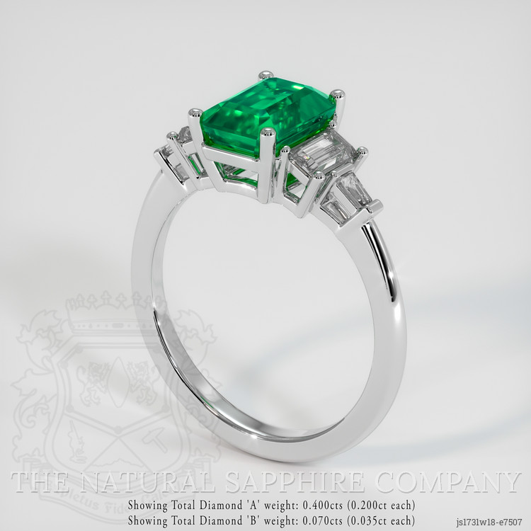 The setting is rendered entirely in 18K white gold, with minimal metal intrusion around the table and pavilion to maximize light passage and visual access to the stone. Corner prongs secure the emerald while preserving the open table area, allowing the gem to present its saturated green unobstructed. The raised gallery and open undercarriage are designed to admit light into the pavilion, enhancing internal reflection without masking natural inclusions. Flanking the center stone are straight baguette white diamonds totaling approximately 0.40 carats, clarity grades VS1 and VS2, color grade E, together with tapered baguette white diamonds of approximately 0.07 carats, clarity grades VS1 and VS2, color grade E. These colorless, high clarity diamonds act as neutral, reflective accents, increasing the perceived brightness of the setting and directing visual focus to the emerald, while their step cut geometry complements the emerald cut profile.