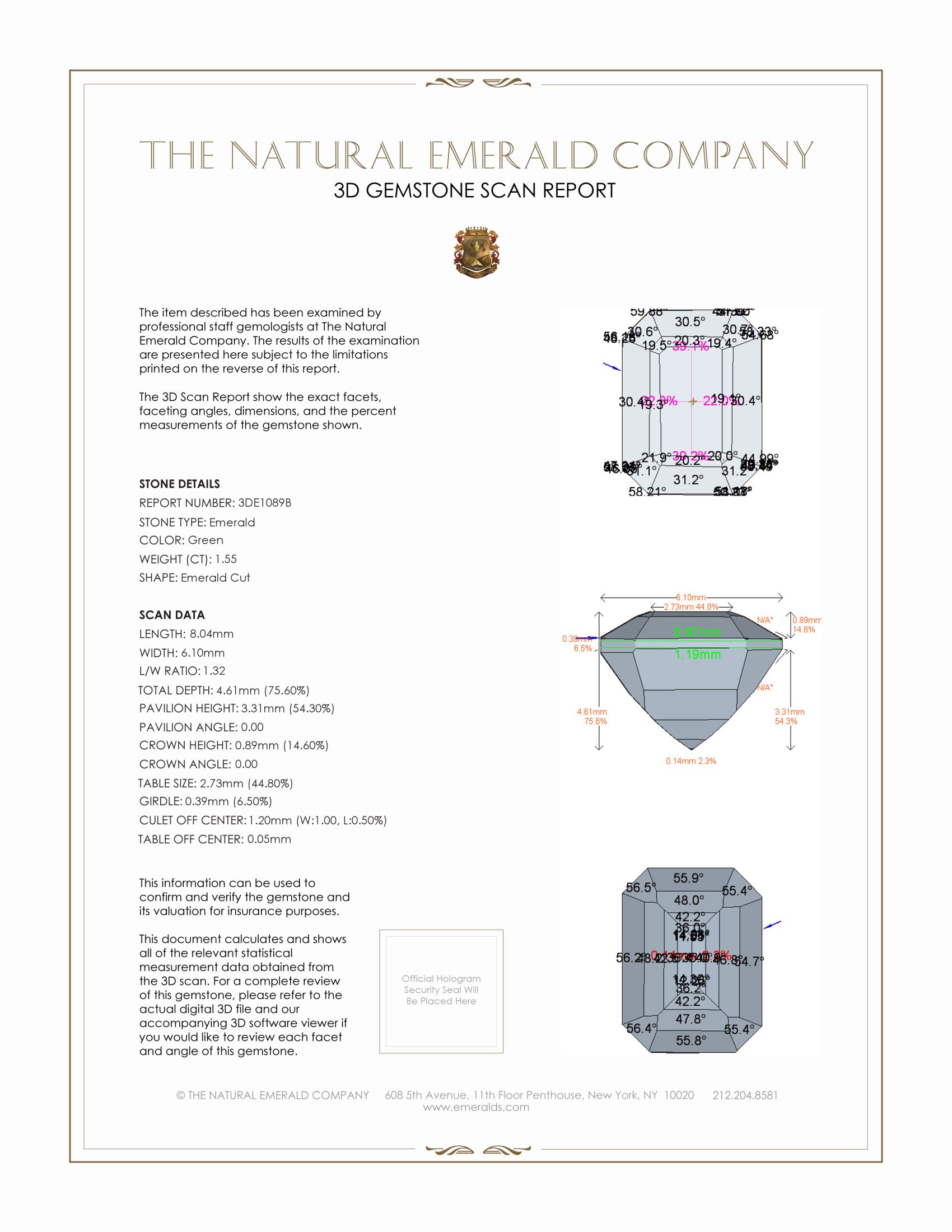 The ring features a beautiful, transparent 1.55 carat emerald cut shape green emerald with the dimensions of 8.04 x 6.10 x 4.61 mm and a emerald cut. It has a clarity grade of slightly included (evaluated at eye level), medium color saturation, and an excellent polish. The origin of this emerald is Zambia.