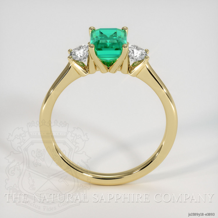 Framing the emerald, delicate round white diamonds weigh approximately 0.50 carats, their sparkle like stars caught in the gentle embrace of a summer’s night. With a clarity grade of Very Slightly Included and a color grade of G, these diamonds dance around the center stone like companions sharing a joyful dance. The combination is set against the warm glow of 18K yellow gold, a backdrop that enhances the harmony and crafts a masterpiece of timeless allure. Each element is crafted to perfection, reflecting an excellent polish that makes the ring glow with the light of countless dreams and promises.
