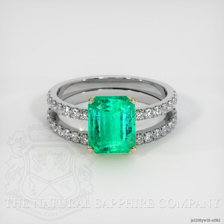 The ring features a beautiful, transparent 1.60 carat emerald cut shape green emerald with the dimensions of 7.46 x 6.10 x 4.52 mm and a emerald cut. It has a clarity grade of very slightly included (evaluated at eye level), medium color saturation, and an excellent polish. The origin of this emerald is Zambia.