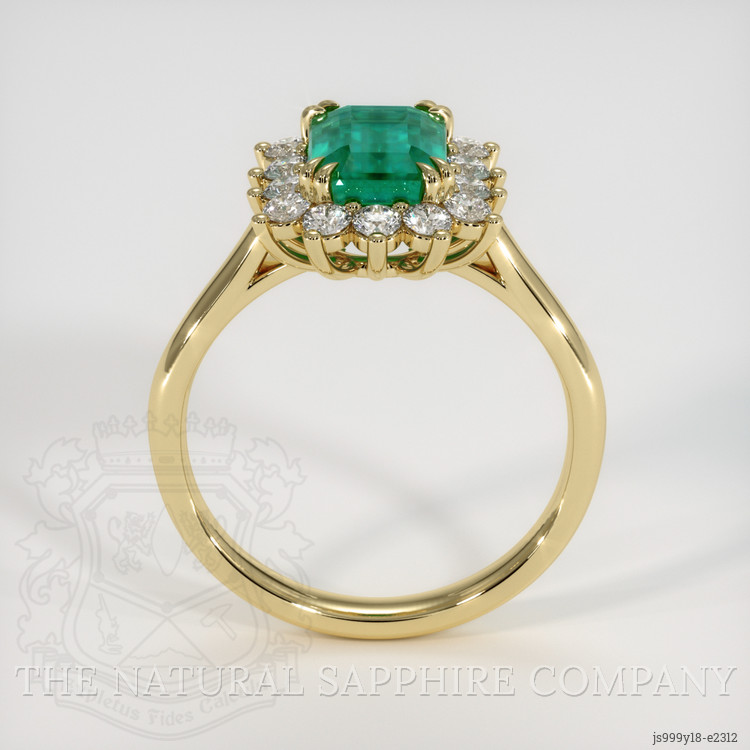 The ring features a beautiful, transparent 1.64 carat emerald cut shape green emerald with the dimensions of 7.93 x 5.92 x 4.68 mm and a step cut. It has a clarity grade of slightly included (evaluated at eye level), medium color saturation, and an excellent polish. The origin of this emerald is Zambia.