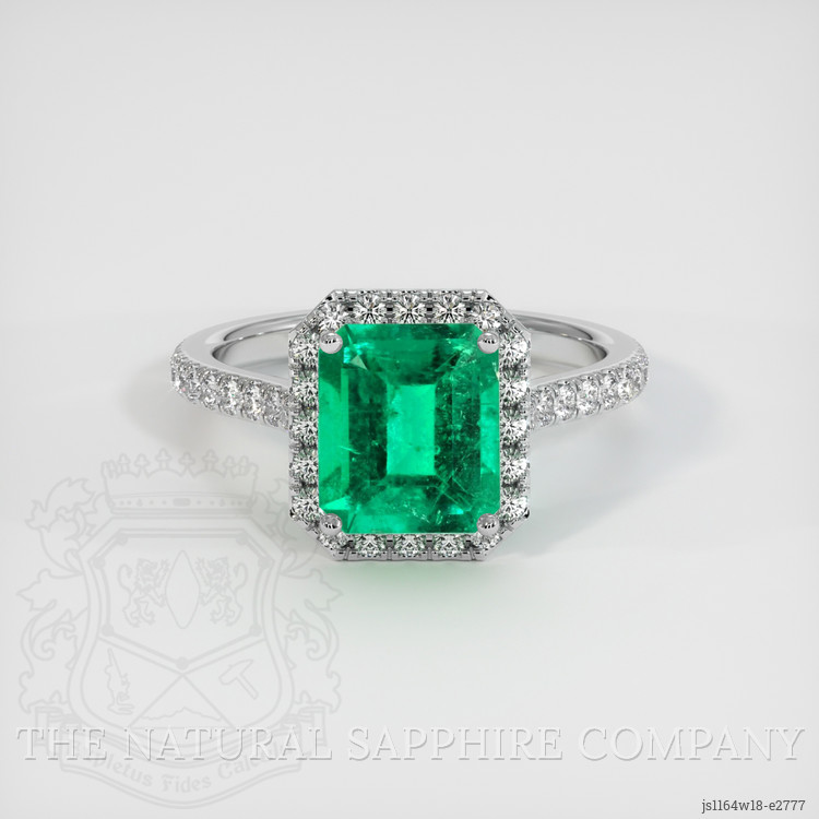 The ring features a beautiful, transparent 1.68 carat emerald cut shape green emerald with the dimensions of 8.07 x 6.83 x 4.59 mm and a step cut. It has a clarity grade of very slightly included (evaluated at eye level), intense color saturation, and an excellent polish. The origin of this emerald is Colombia.