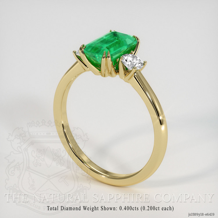 Complementing the center stone are two white round-shaped diamonds, equally reflective of luxurious elegance. At approximately 0.40 carats, with a sophisticated clarity grade of VS1-VS2 and a color grade of F, these diamonds offer a pure sparkle that intersects beautifully with the emerald's rich green tones. Each diamond is meticulously handset to ensure maximum brilliance and stability, drawing inspiration from renowned heirloom pieces like the diamonds set in the British Crown Jewels, evoking a sense of lineage and refined beauty.