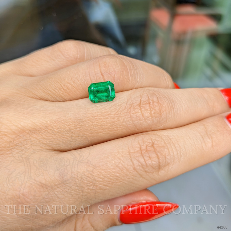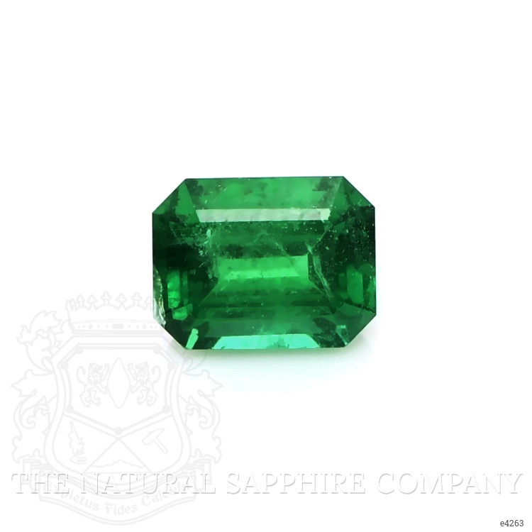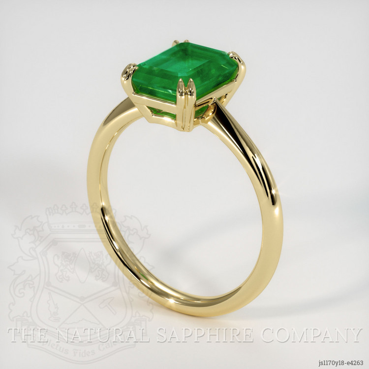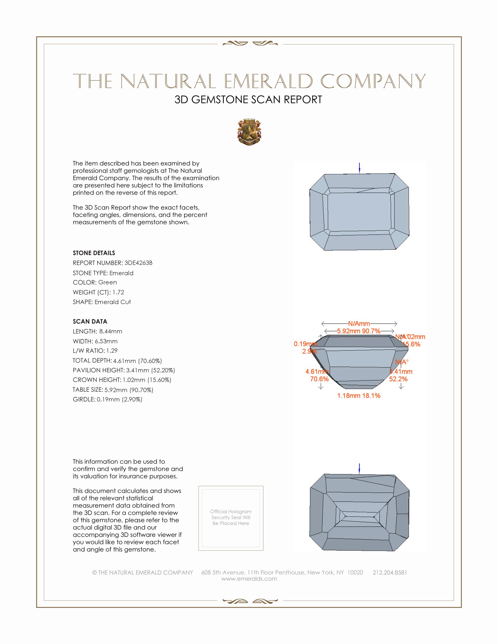 The ring features a beautiful, transparent 1.72 carat emerald cut shape green emerald with the dimensions of 8.38 x 6.44 x 4.56 mm and a emerald cut. It has a clarity grade of slightly included (evaluated at eye level), vivid color saturation, and an excellent polish. The origin of this emerald is Zambia.