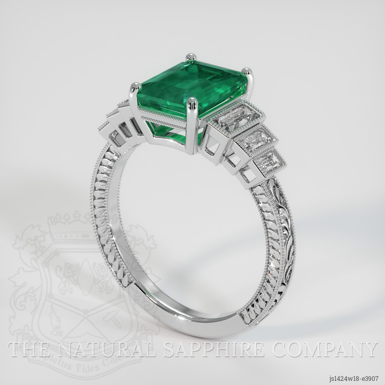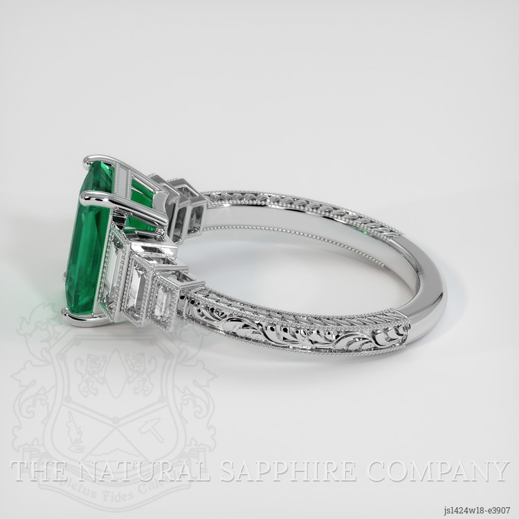 The emerald is surrounded by a selection of baguette shaped natural diamonds, carefully chosen to complement the centerpiece. The combined weight of these diamonds is approximately 0.62 carats, featuring a high clarity grade of Very Slightly Included (VS1, VS2) and an impeccable E color grading. These diamonds serve to accentuate the emerald's vibrant green hue, offering a stark yet harmonious contrast with their crisp whiteness. Presented in three sections, the baguette diamonds are arranged thoughtfully to provide a coherent design, breathing elegance and sophistication into the ring’s overall aesthetic.