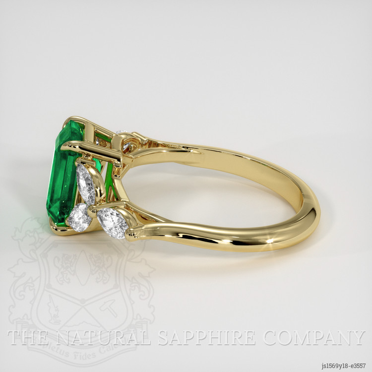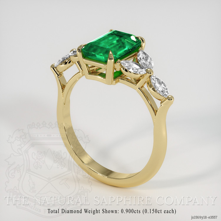 To caress the emerald's beauty, white marquise-shaped diamonds, grown in labs but bearing the profound clarity of nature itself, weigh a graceful 0.90 carats. These diamonds encircle the emerald like delicate whispers in a lover’s ear, their clarity and color of VS1, VS2, and E grade echoing the purity of newfound love. Each marquise diamond is as a radiant petal, unfurling in the golden embrace of an 18K yellow gold band. A metaphor for commitment, this gold setting promises the brilliance of tomorrow, steadfast and endless.