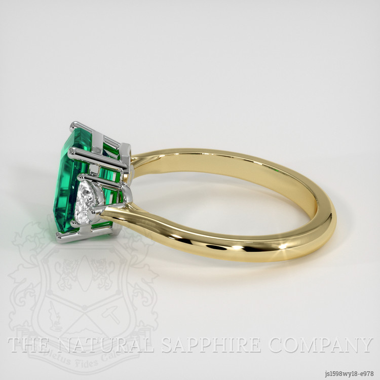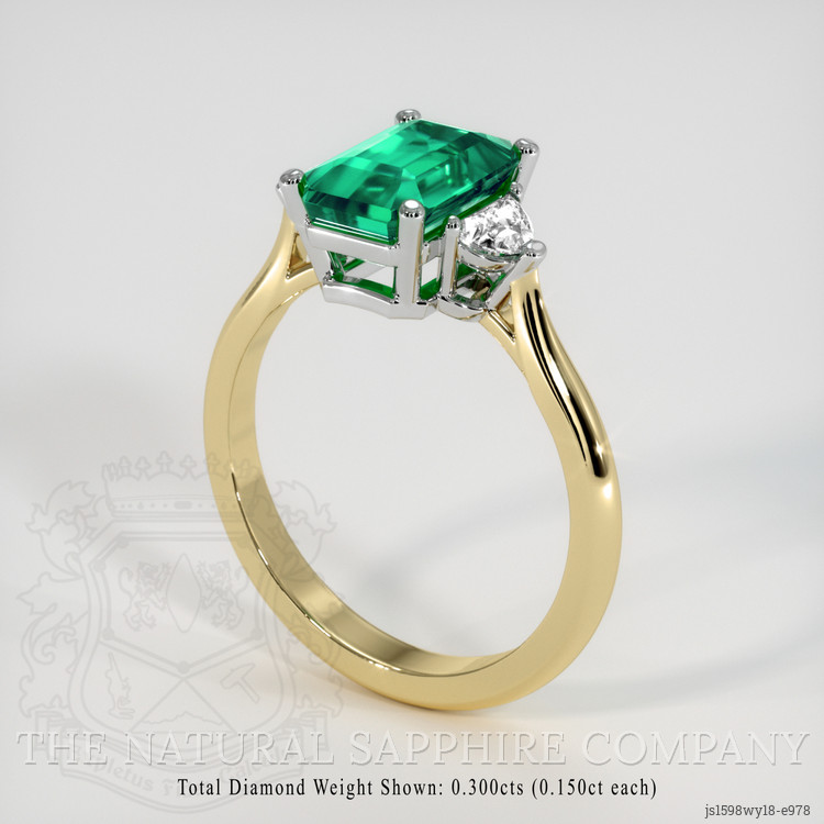 Accompanying this emerald are two dazzling white half-moon-shaped diamonds. Weighing approximately 0.30 carats, these diamonds possess a clear VS1 to VS2 clarity and a color grade of E. Nestled on each side of the emerald, they represent celestial bodies guiding a voyager, enhancing the already mesmerizing quality of the central gemstone. Their presence is crafted to accentuate and not overshadow, allowing the emerald to be the narrative's centerpiece while offering a serene, balanced radiance. The interplay between these magnificent diamonds and the emerald reverberates with an understated elegance unique to our designs.