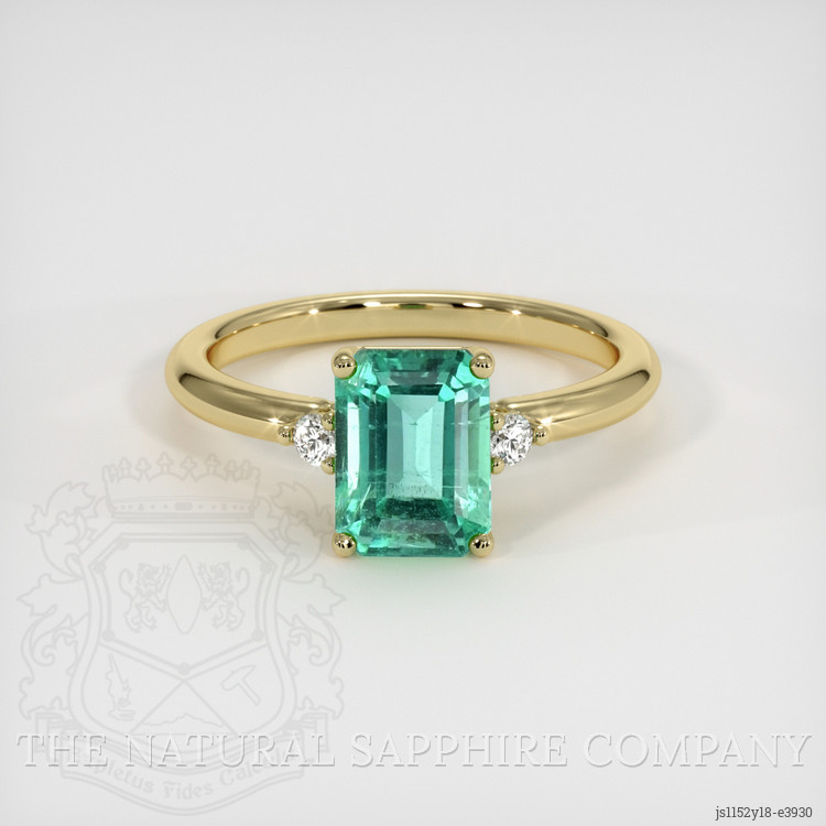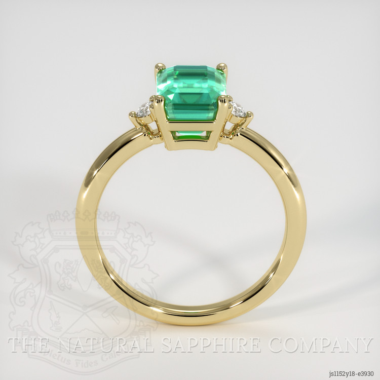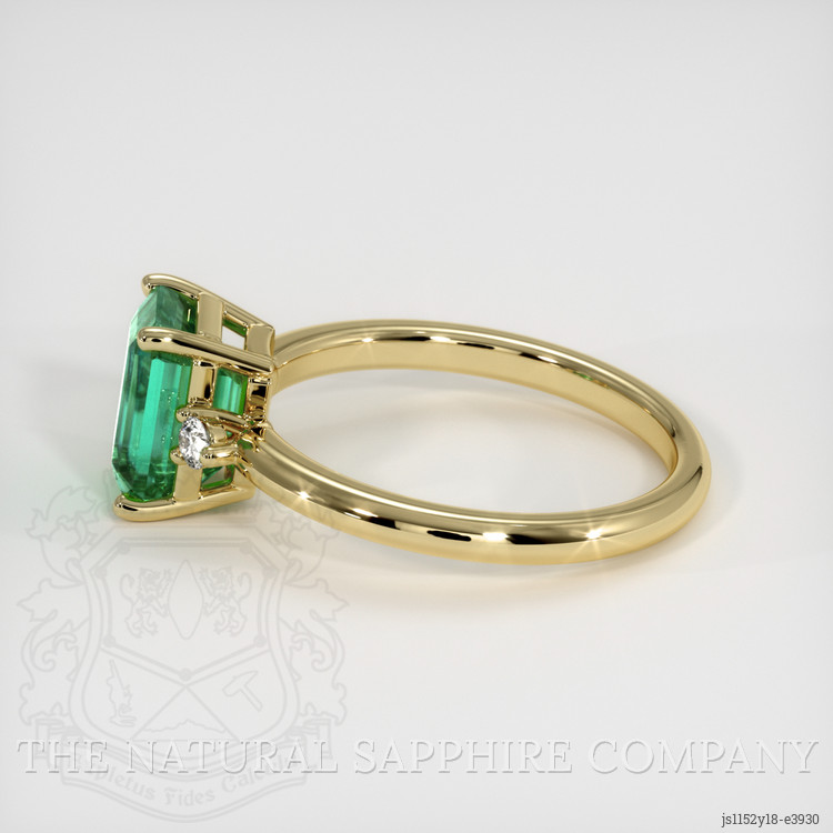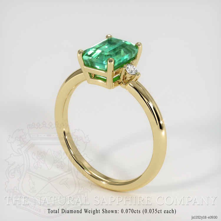 The ring features a beautiful, transparent 1.86 carat emerald cut shape green emerald with the dimensions of 8.06 x 6.03 x 5.08 mm and a emerald cut. It has a clarity grade of very slightly included (evaluated at eye level), medium color saturation, and an excellent polish. The origin of this emerald is Zambia.
