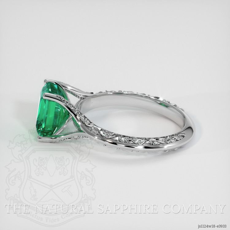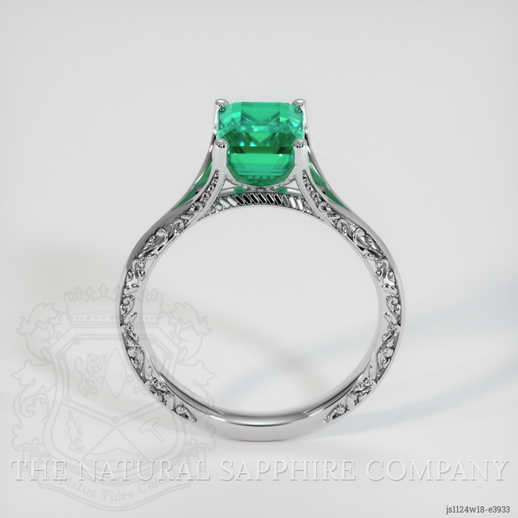 The ring features a beautiful, transparent 1.89 carat emerald cut shape green emerald with the dimensions of 8.12 x 6.14 x 4.54 mm and a emerald cut. It has a clarity grade of very slightly included (evaluated at eye level), medium color saturation, and an excellent polish. The origin of this emerald is Zambia.