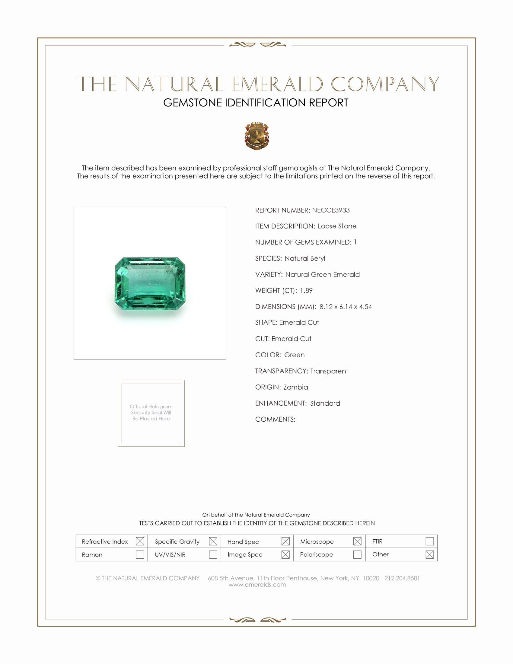 Introducing an exquisite creation from The Natural Emerald Company, this ring showcases a captivating 1.89 carat emerald that promises to become a timeless treasure for any discerning collector. Skillfully crafted in an emerald cut, the stone reveals its unique dimensions of 8.12 x 6.14 x 4.54 mm, accentuating the inherent elegance of its geometric symmetry. The careful faceting typical of the emerald cut enhances the inherent beauty of the gem, allowing light to dance within its depths and highlighting its immersive green hue.
