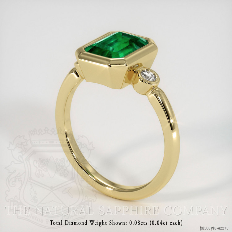 The ring features a beautiful, transparent 1.90 carat emerald cut shape green emerald with the dimensions of 8.51 x 6.42 x 4.86 mm and a step cut. It has a clarity grade of very slightly included (evaluated at eye level), vivid color saturation, and an excellent polish. The origin of this emerald is Zambia.
