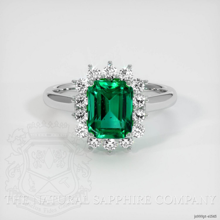 The ring features a beautiful, transparent 1.91 carat emerald cut shape green emerald with the dimensions of 8.30 x 6.32 x 5.16 mm and a emerald cut. It has a clarity grade of very slightly included (evaluated at eye level), intense color saturation, and an excellent polish. The origin of this emerald is Zambia.