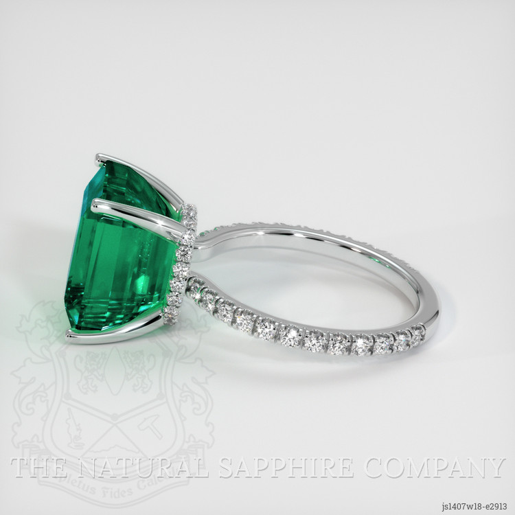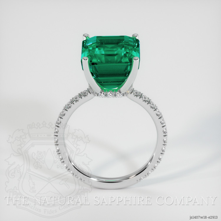 The ring features a beautiful, transparent 10.48 carat emerald cut shape green emerald with the dimensions of 13.23 x 11.41 x 8.86 mm and a emerald cut. It has a clarity grade of very slightly included (evaluated at eye level), intense color saturation, and an excellent polish. The origin of this emerald is Zambia.