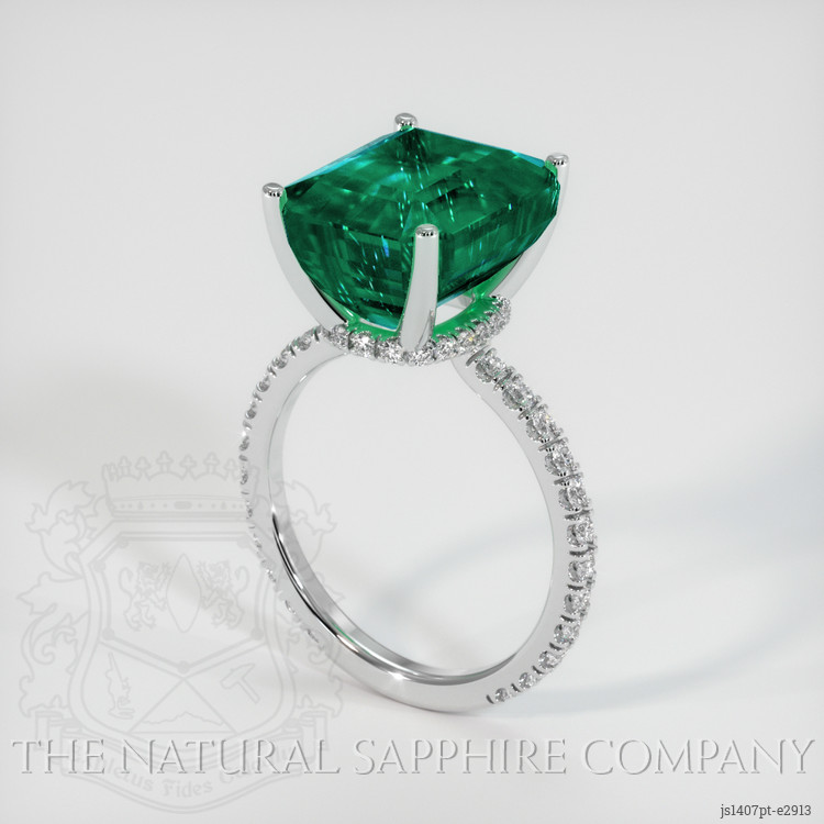 The ring features a beautiful, transparent 10.48 carat emerald cut shape green emerald with the dimensions of 13.23 x 11.41 x 8.86 mm and a emerald cut. It has a clarity grade of very slightly included (evaluated at eye level), intense color saturation, and an excellent polish. The origin of this emerald is Zambia.