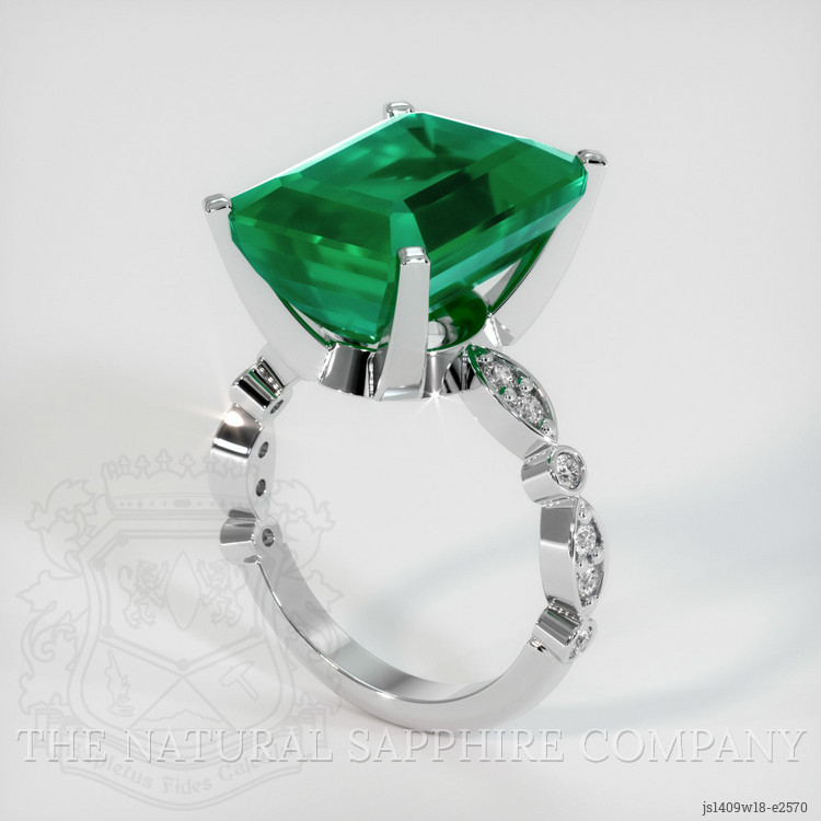 The ring features a beautiful, transparent AGL certified 11.15 carat emerald cut shape green emerald with the dimensions of 15.09 x 11.45 x 8.18 mm and a emerald cut. It has a clarity grade of very slightly included (evaluated at eye level), vivid color saturation, and an excellent polish. The origin of this emerald is Zambia.