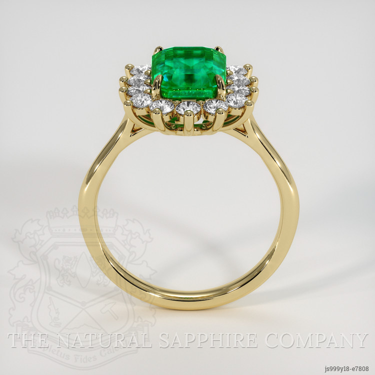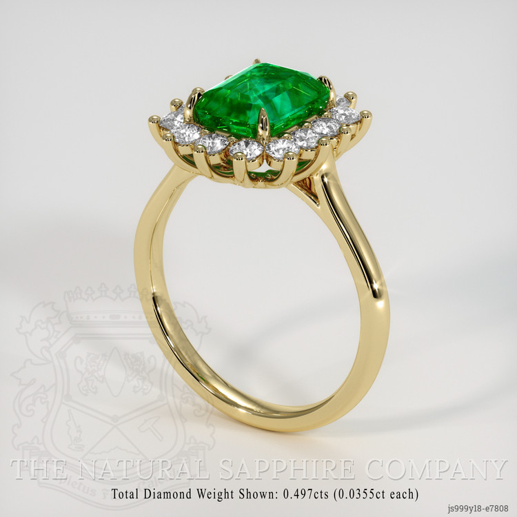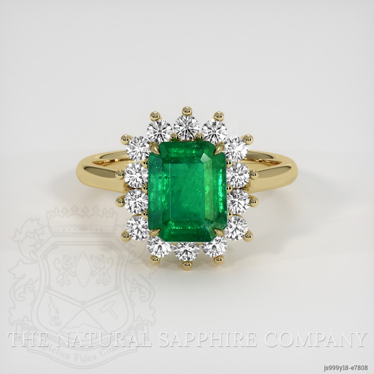 This ring is a study in cultivated elegance, centered on a transparent Zambian emerald of 2.08 carat, cut in a classic emerald cut with dimensions 8.43 by 6.65 by 5.11 millimeters, presenting vivid color saturation and an excellent polish, with clarity evaluated as slightly included at eye level and enhancement performed to standard. Surrounding this magnificent green center are white round shaped lab grown diamonds totaling approximately 0.497 carat, with clarity grades of Very Slightly Included VS1 and VS2, and a color grade of F, each diamond selected to harmonize with the emeralds depth and luster. The entire composition is set in sumptuous 18K yellow gold, a warm and enduring setting that frames the stones with a timeless profile, and creates a singular piece that commands attention and admiration. At The Natural Emerald Company we source with integrity and present each gem as a declaration of refined taste, and this ring is no exception.
