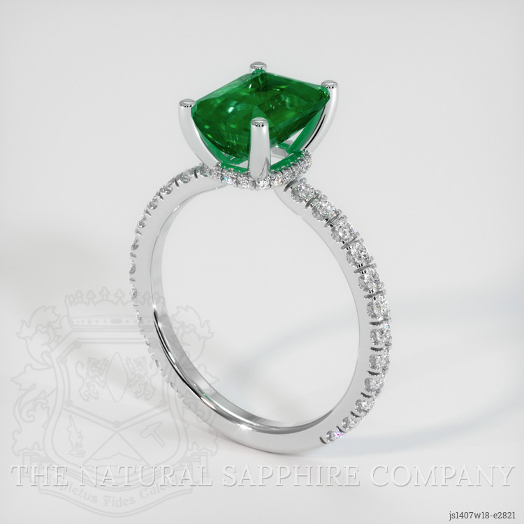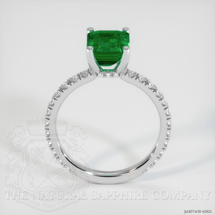 The ring features a beautiful, transparent 2.10 carat emerald cut shape green emerald with the dimensions of 8.93 x 6.89 x 4.82 mm and a emerald cut. It has a clarity grade of very slightly included (evaluated at eye level), intense color saturation, and an excellent polish. The origin of this emerald is Zambia.
