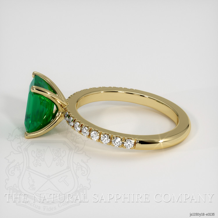 The emerald is accompanied by meticulously selected white round diamonds, weighing approximately 0.45 carats. Each diamond holds a clarity grade of VS1/VS2 and is classified with a color grade of F, ensuring exceptional brilliance and fire. These diamonds serve not only as accompaniments but as enhancers of the emerald's natural allure, creating a symphony of reflections. Set in a rich 18K yellow gold band, the combination of stones is elevated further, producing an elegant contrast that emphasizes the uniqueness of each element. The yellow gold provides a warm, luxurious backdrop, offering both durability and a timeless appeal.