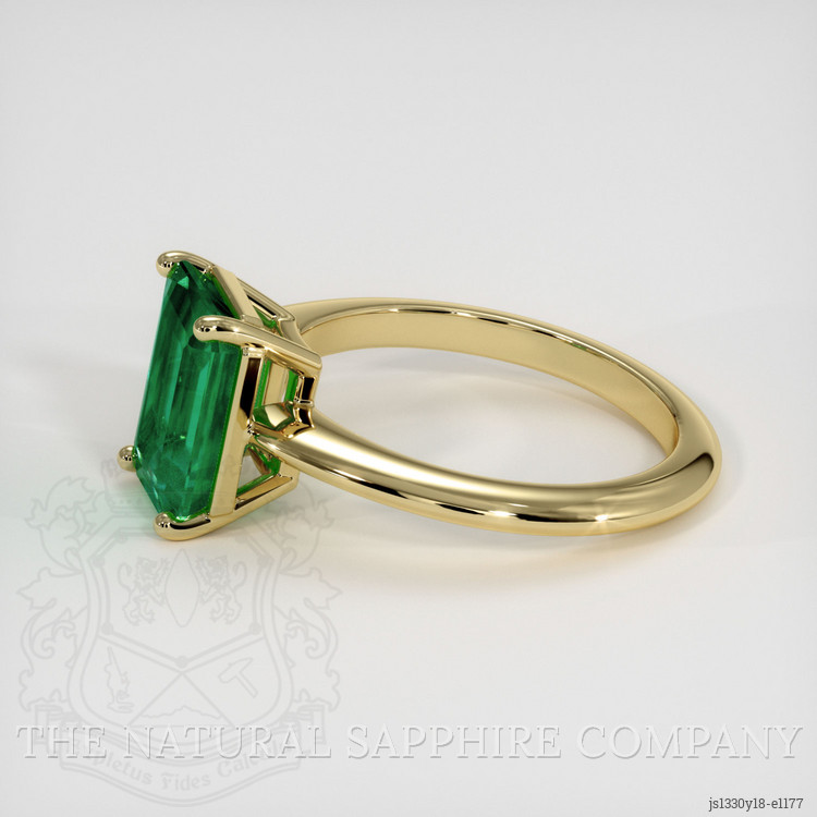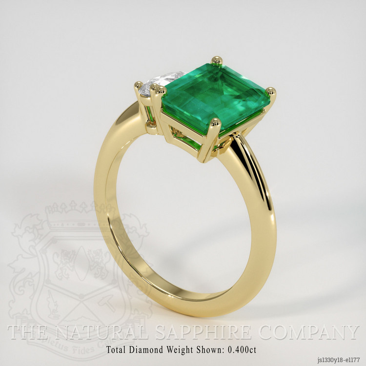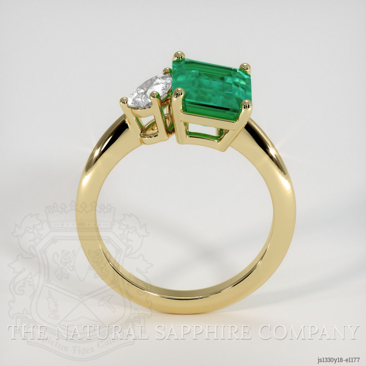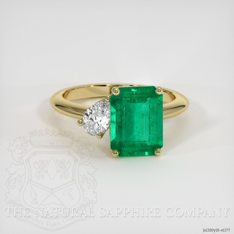 The hero of this ring is elegantly accompanied by brilliantly shimmering white pear-shaped diamonds, weighing approximately 0.40 carats. Cut for perfection, these diamonds boast a Very Slightly Included clarity (VS1, VS2) and an impeccable color grade of E. Together, the emerald and diamonds create a dance of light and contrast. They are perfectly set against the warm glow of 18K yellow gold. The juxtaposition of the green emerald with the clear diamonds and golden band evokes a sense of regal grandeur. Each element is meticulously chosen and harmoniously crafted to redefine sophistication.