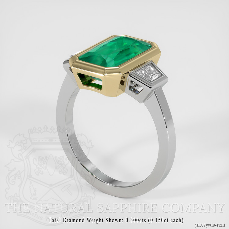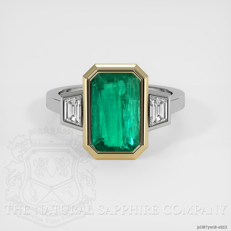 With a vivid color saturation, this emerald becomes alive beneath one's gaze, evoking endless fields of green under a luminous spring sky. The step cut lends it an exquisite dance of light, each facet creating a captivating display of nature’s brilliance. Though the stone bears inclusions, these are but whispers of its journey from earth’s depths, akin to the unique imperfections that define a sculptor's masterpiece, hidden yet cherished. Nestled beside this verdant wonder are white trapezoid-shaped natural diamonds, approximating a combined weight of 0.30 carats. Their clarity, graded at VS1 and VS2, elevates the emerald's hue, akin to the morning star igniting the dawn sky, and their color grade of E meets the highest standards of elegance and impeccable beauty.