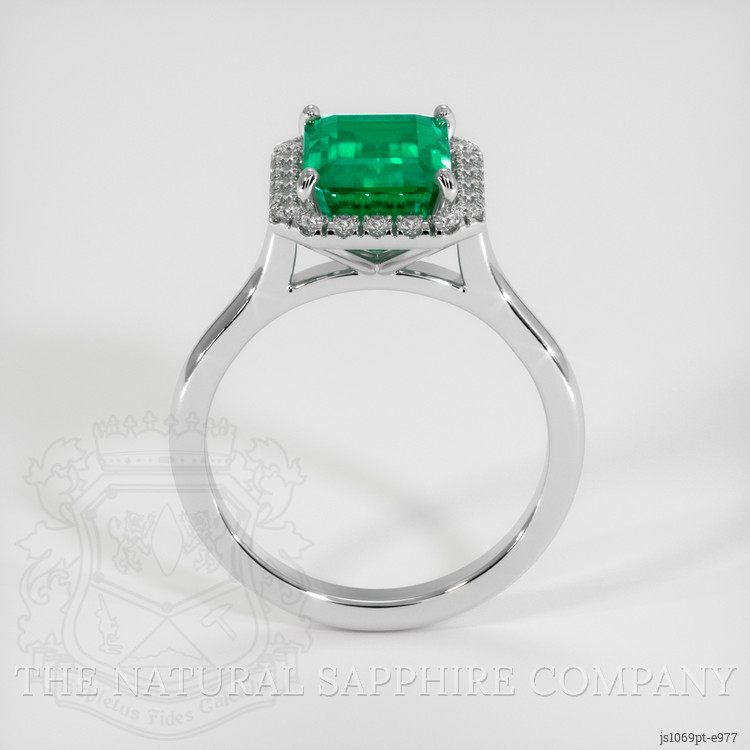 The ring features a beautiful, transparent 2.63 carat emerald cut shape green emerald with the dimensions of 9.20 x 6.99 x 5.19 mm and a emerald cut. It has a clarity grade of very slightly included (evaluated at eye level), medium color saturation, and an excellent polish. The origin of this emerald is Zambia.