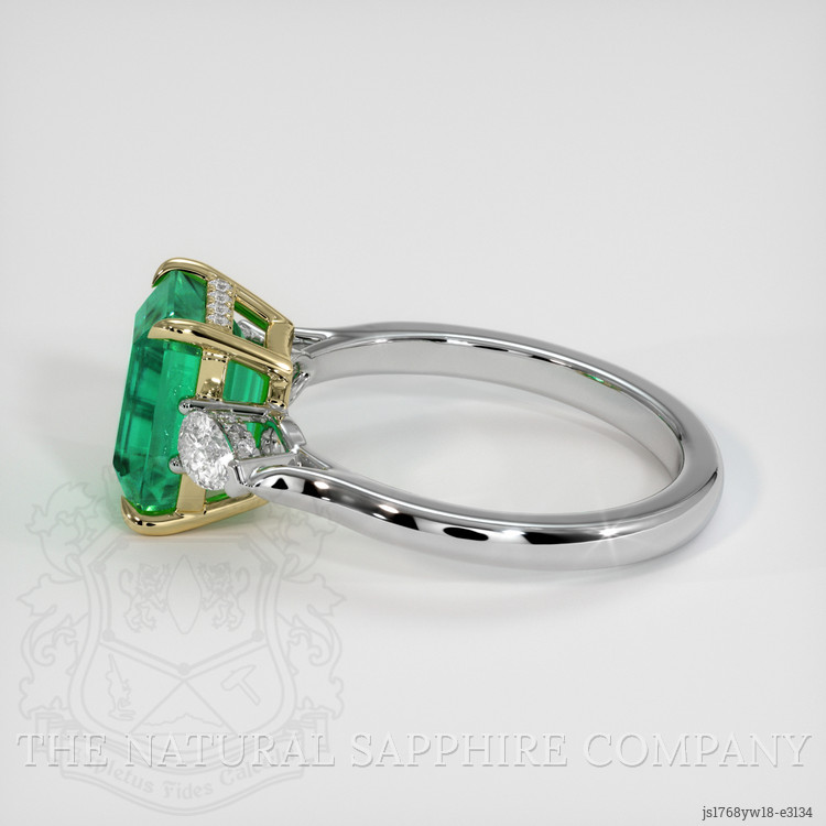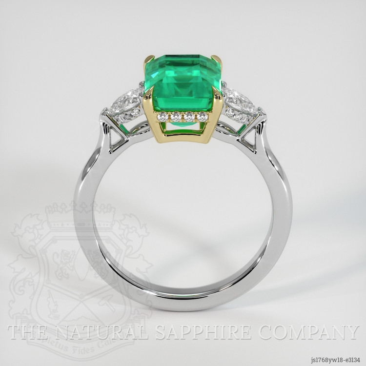 The sophisticated setting of this ring amplifies the emerald's natural allure. Crafted in a combination of 18K yellow gold and 18K white gold, the setting acts not only as a bezel but as a complementary backdrop that enhances the gemstone's magnificent color. The yellow gold subtly amplifies the emerald's green, mirroring the gemstone's warmth and intensity. This contrast is further elevated by the inclusion of pear-shaped diamonds, each weighing approximately 0.30 carats, with a clarity of VS1/VS2 and a pristine color grade of E. These diamonds serve as pristine accent stones, their clarity and color forming a mirror to the purity and richness of the central emerald while the crisp white hue of the diamonds contrasts starkly with the other subtle white round stones in the setting.