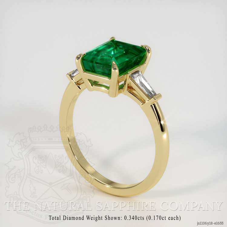 The ring features a beautiful, transparent 2.71 carat emerald cut shape green emerald with the dimensions of 9.02 x 7.19 x 6.02 mm and a emerald cut. It has a clarity grade of very slightly included (evaluated at eye level), vivid color saturation, and an excellent polish. The origin of this emerald is Zambia.