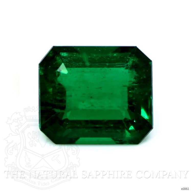 The ring features a beautiful, transparent 2.75 carat emerald cut shape green emerald with the dimensions of 9.37 x 8.09 x 4.92 mm and a emerald cut. It has a clarity grade of very slightly included (evaluated at eye level), vivid color saturation, and an excellent polish. The origin of this emerald is Zambia.