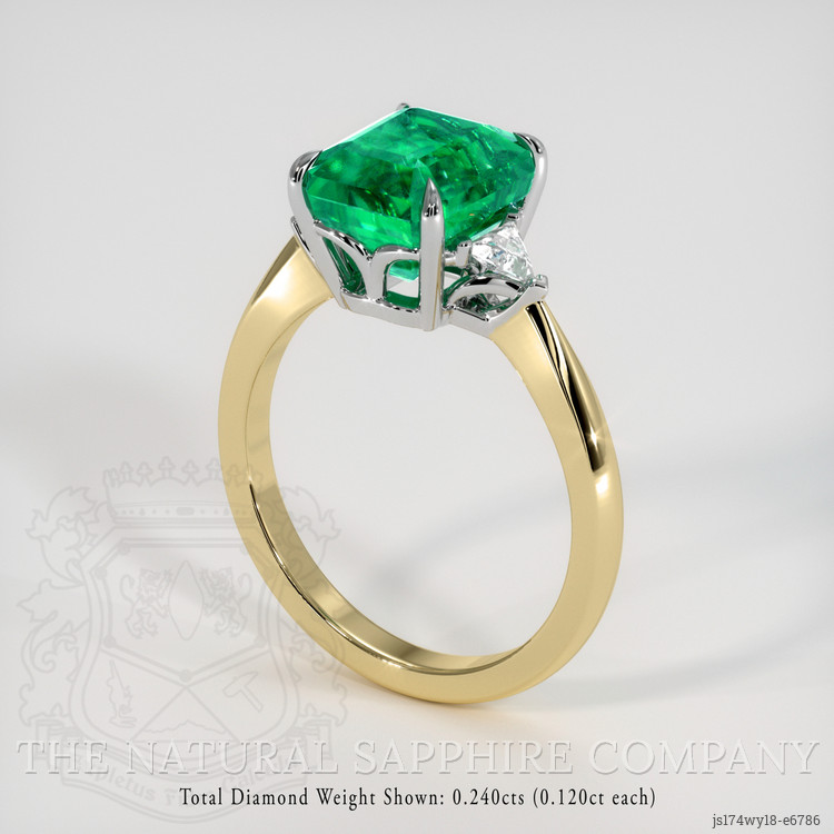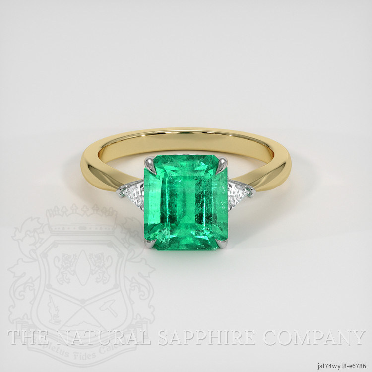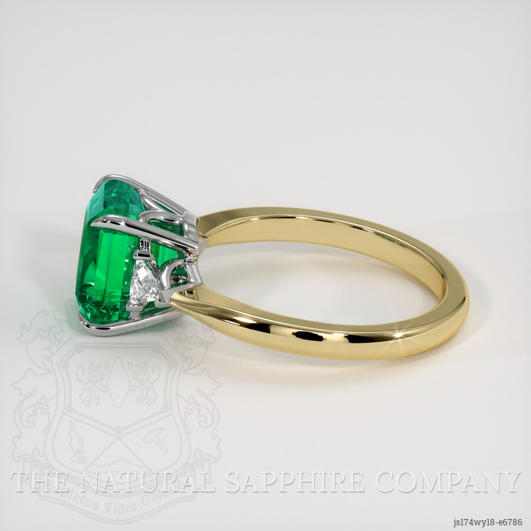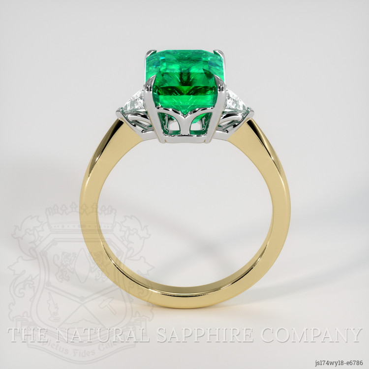Framing this jewel are white trillion shaped diamonds, twinkling like distant stars against a midnight sky. With a combined weight of approximately 0.24 carats, these diamonds possess a clarity of VS1 and VS2 and shimmer with a color grade of E. Their inclusion serves not only as a contrast but adds a heavenly sparkle that elevates the emerald’s verdant depths to celestial heights. This harmonious ensemble is set in the refined dual tones of 18K white and yellow gold, a nod to tradition and modernity interwoven seamlessly in design.