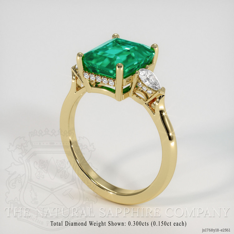 Wrapped in the warm embrace of 18K yellow gold, the emerald rests beside an exquisite arrangement of sparkling white diamonds. Nestled on either side of the rich green gem are white pear-shaped diamonds, their gentle curves mirroring the form of a loving heart. These diamonds, together weighing approximately 0.30 carats and with pristine VS1 and VS2 clarity, symbolize purity and the eternal nature of love, free from imperfections. Their color grade of E radiates a flawless charm, capturing the light like fresh fallen snow glistening in the morning sun. Tying this celestial ensemble together are white round diamonds that add delicate sparkles, amounting to a combined weight of 0.188 carats, with their own clarity of VS1 and VS2 and a color grade F, ensuring each diamond mimics a starry sky in its clarity and brilliance.