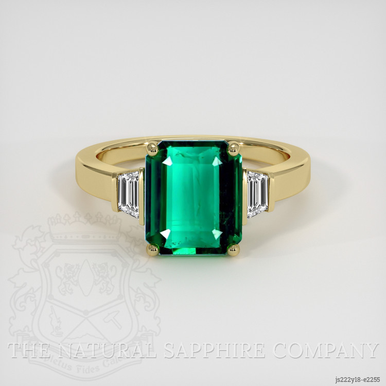 Accompanying this magnificent emerald are white trapezoid-shaped diamonds, subtly enhancing the central stone with their complementary sparkle. Together, they weigh approximately 0.60 carats. These diamonds have a clarity grade of Very Slightly Included (VS1, VS2), ensuring a clear and radiant display. Their color grade of E provides a pristine, near-colorless brilliance that contrasts beautifully with the lush green of the emerald. These premium diamonds enhance the ring's overall luxury without overshadowing the centerpiece. The blend of clarity and color in the diamonds highlights the sophistication and timeless charm of the design.