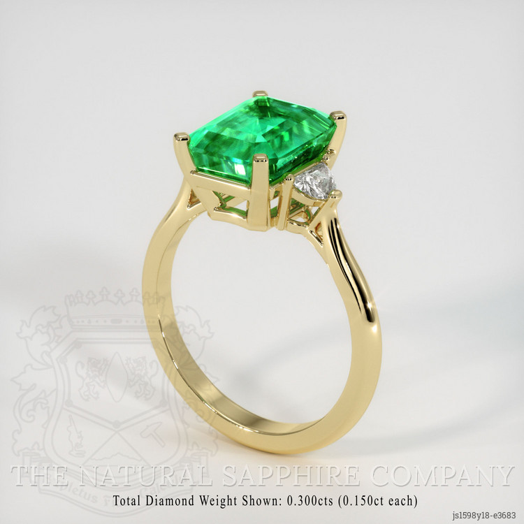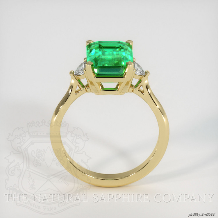 The ring features a beautiful, transparent 3.11 carat emerald cut shape green emerald with the dimensions of 10.21 x 7.37 x 5.63 mm and a emerald cut. It has a clarity grade of slightly included (evaluated at eye level), intense color saturation, and an excellent polish. The origin of this emerald is Colombia.