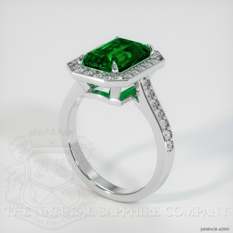 The ring features a beautiful, transparent 3.16 carat emerald cut shape green emerald with the dimensions of 10.10 x 7.29 x 5.64 mm and a emerald cut. It has a clarity grade of very slightly included (evaluated at eye level), vivid color saturation, and an excellent polish. The origin of this emerald is Zambia.
