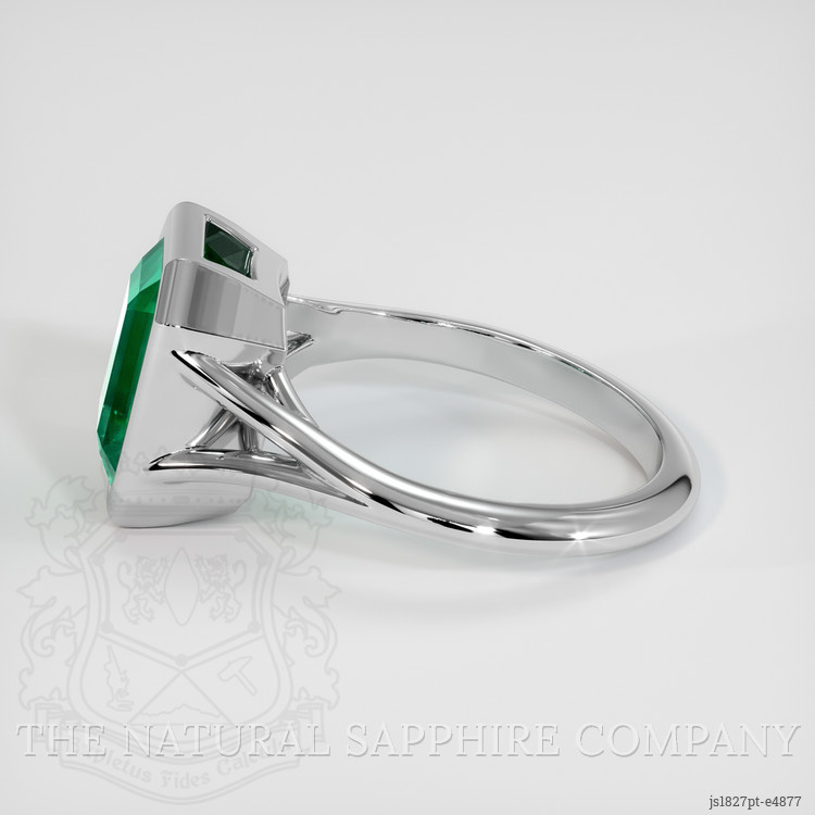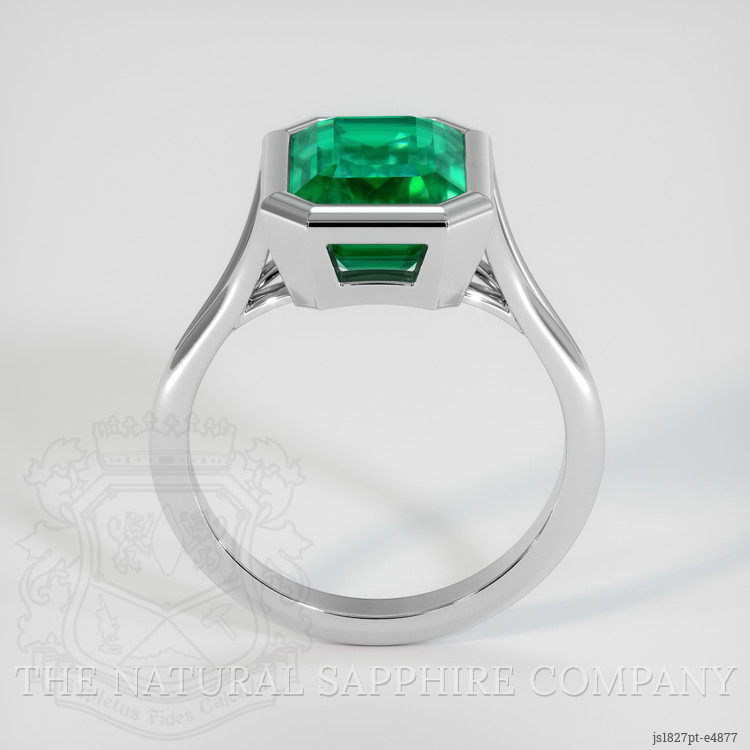 The mounting in platinum 950 has been executed with technical consideration for both security and proportion, providing a durable, inert metal palette that complements the cool, saturated green of the emerald. Platinum 950 offers substantial density and tensile strength, which allows for a low profile bezel and a clean, crisp bezel lip that protects the emerald s entire girdle while exposing the crown facets sufficiently to allow optimal light interaction. The setting design incorporates an open undergallery, permitting light to enter the pavilion and aiding in face up brightness, while the bezel geometry follows the emerald cut silhouette to protect the truncated corners that are intrinsic to the cut. The ring architecture includes tapered shoulders and stress mitigated junctions at the gallery, which distribute load away from the setting points and reduce the risk of prongs or bezel deformation over time. The finish on the platinum is highly polished, and the interface between the metal and the emerald has been seated with tight tolerances, ensuring that the gem sits squarely within the bezel, minimizing girdle exposure and balancing security with visual presence.