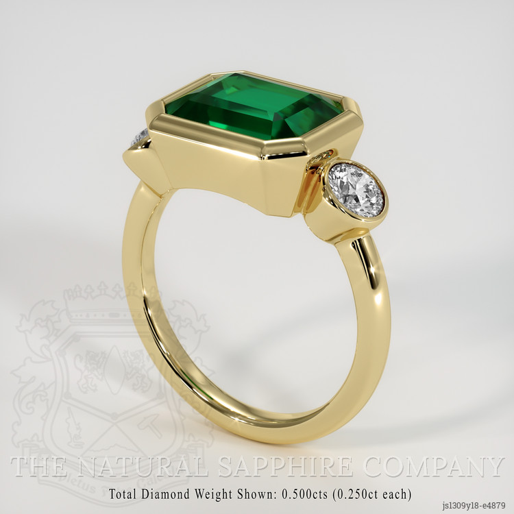 The emerald is expertly complemented by two white round diamonds, strategically placed to enhance the ring's overall sparkle and sophistication. With a total weight of approximately 0.50 carats, these diamonds add a refined brilliance to the piece. Each diamond boasts a clarity grade of Very Slightly Included (VS1, VS2) and a pristine color grade of F, ensuring a flawless appearance from every angle. The careful selection of these diamonds provides a striking contrast to the vivid green of the emerald, resulting in a harmonious blend of colors that sets this ring apart from ordinary jewelry.